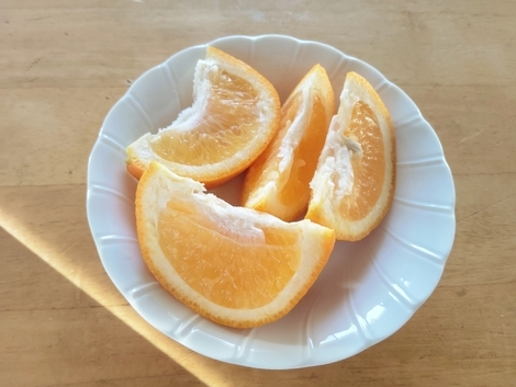 ごはん、味噌汁、納豆、なます、ゆで小松菜、いよかん