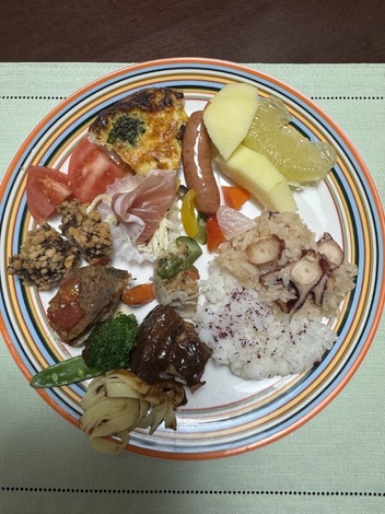 たこ親爺のお墨付きというふるさと納税のたこを使用してたこ飯、しめじ、玉ねぎ、シャウエッセン、ブロッコリー、コーンを炒め卵液と混ぜてチーズを乗せオーブンで焼いたスパニッシュオムレツ風。