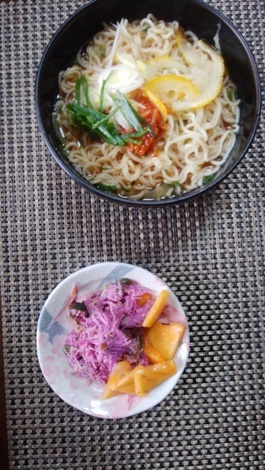 家でできた野菜や果物を使っています。菊の花を酢漬けにしました。ゆずの香りがたまりません。冷凍した柿を入れると、甘さが増し、絶品ですよ。ラーメンには、分葱をふんだんに入れてあります。