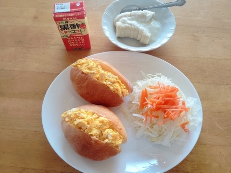 パン、コールスロー、バナナヨーグルト、コーヒー牛乳