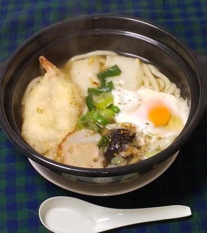 寒い冬、心が温まる冬の風物詩は鍋焼きうどんです。姉が高校生の時バイト先の名物でした。エビ天と焼いたお餅が二つ、味椎茸、梅麩、九条ネギ、卵、山椒のきいた七味つきです。風邪気味の時は熱々の富美屋鍋を食べて布団をかぶって寝ると一発で治ります