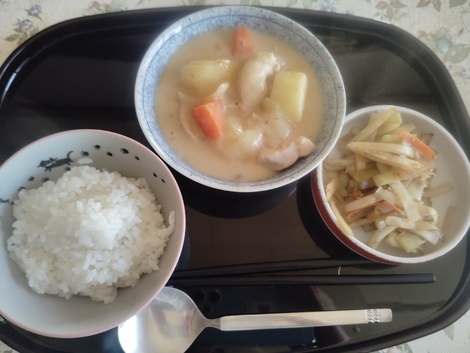 ご飯、シチュー、大根のきんぴら