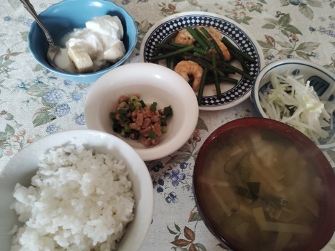 海老とニンニクの芽を炒め物、酢の物、納豆、味噌汁。