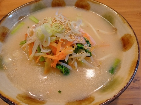 野菜炒めをたっぷりのせた豚骨ラーメンで