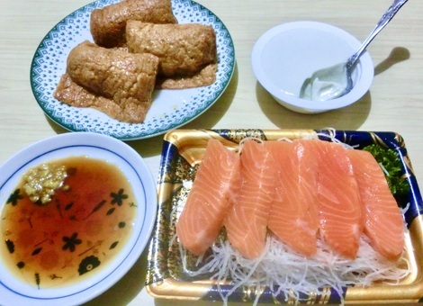 稲荷寿司、サーモンの刺身、枝豆味の豆腐を食べました。