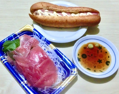 ポテトベーコンドッグ、ビンチョウマグロの刺身を食べました。