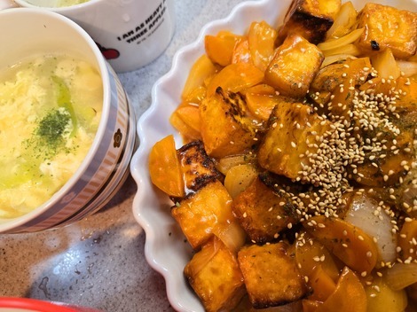 遅い時間の帰宅なので、厚揚げのさっぱり酢鶏&卵スープです🎈🐭