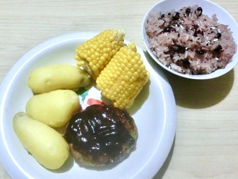 赤飯、ハンバーグ、蒸しジャガ、トウモロコシを食べました。