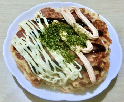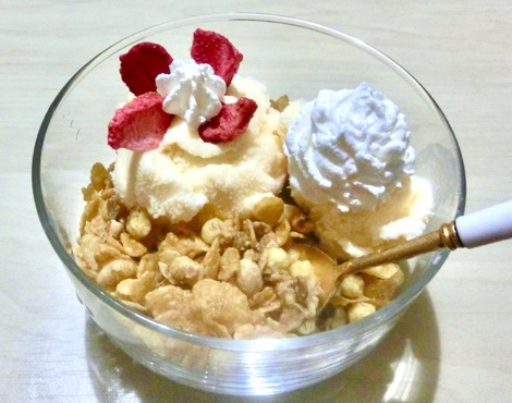 お好み焼き。ホイップクリーム+バニラアイス+グラノラを食べました。