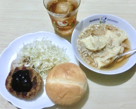 パン、ハンバーグ、キャベツ、エノキを入れたワンタンスープを食べました。