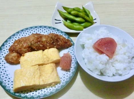 ご飯、明太子、卵焼き、鯖カツ、枝豆を食べました。