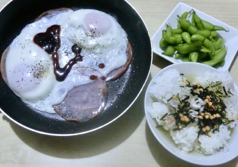 お茶漬け、ハムエッグ、枝豆を食べました。