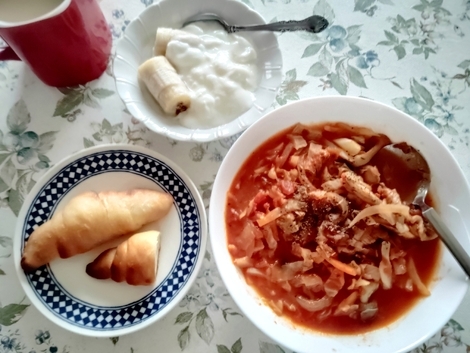 塩パン、豚肉と野菜のトマト煮、バナナヨーグルト