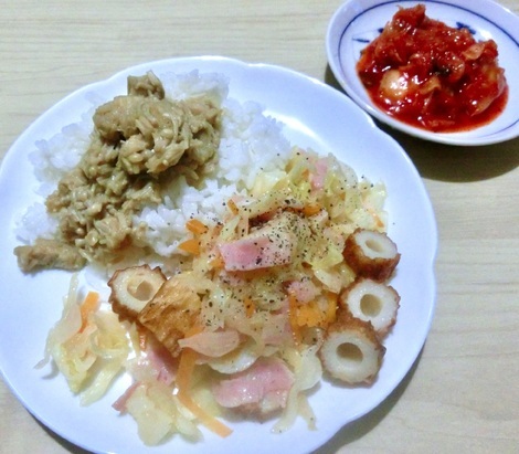 ご飯、えのきバター、炒め物、キムチを食べました。