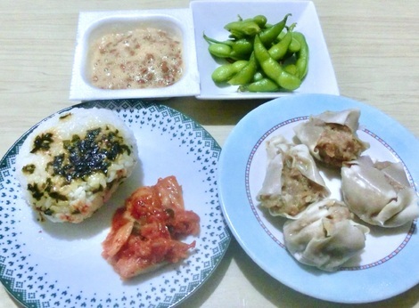 おにぎり、キムチ、焼売、枝豆、納豆を食べました。