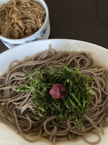 今日は3時のおやつの時間にお昼ご飯です。紫蘇梅干しそばです。麺つゆは極々少量で、とってもしょっぱいなめ茸で味を調整します。いただきます。