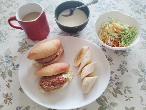 ハンバーグサンド、バナナ、サラダ、ミルクプリン。
