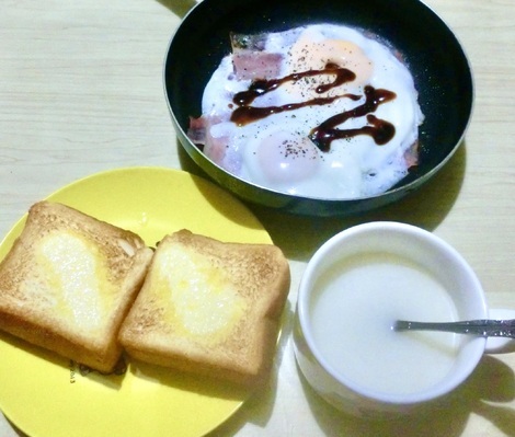 トースト、ベーコンエッグを食べました。