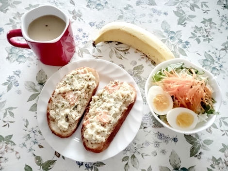 カレー味のポテトサラダのオープンサンド、サラダ、茹で卵、バナナ、コーヒー