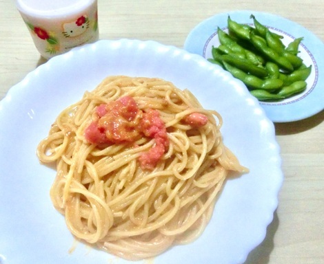 明太子うにクリームスパゲティ、枝豆を食べました。