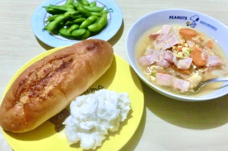ガーリックパン、ポテサラ、具沢山スープ、枝豆を食べました。