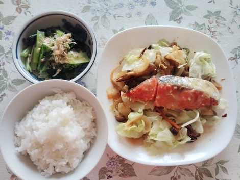ごはん、鮭のちゃんちゃん焼き、茹で小松菜