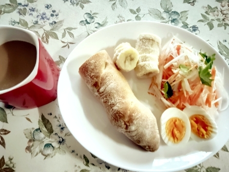 バゲット、茹で卵、大根人参セロリのサラダ、バナナ、カフェオレ☕️
