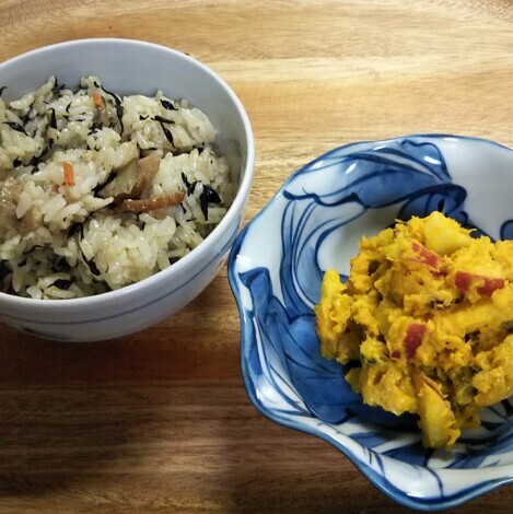 昨日も炊いたけど、今朝も炊き込みごはんを作り、南瓜サラダと一緒に食べました♪