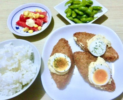 ご飯、サーモンメンチ+ゆで卵、枝豆、カニカマを食べました。