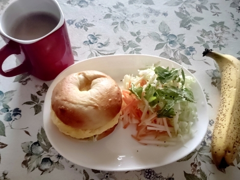 卵サンド、キャベツ人参セロリのサラダ、バナナ、カフェオレ☕️