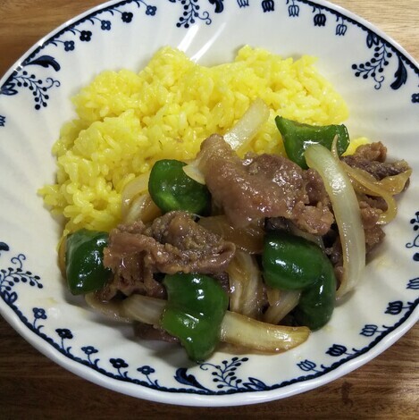 生姜焼きライスです。生姜焼きには玉葱とカットして冷凍してあったピーマンも入れました♪