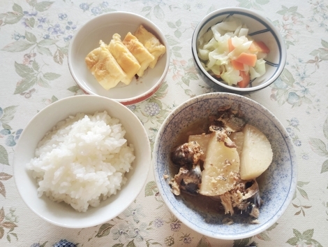 ごはん、大根といわしの煮物、卵焼き、酢キャベツ
