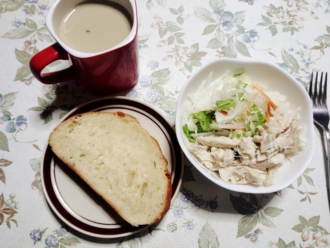 パン、サラダ&チキンサラダ、カフェオレ☕️