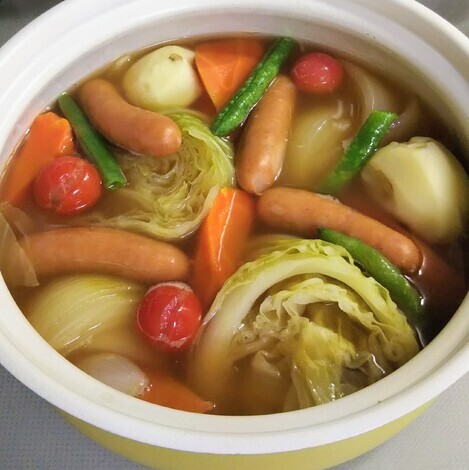 半端なキャベツと玉葱と、冷凍していたミニトマト🍅サヤインゲンも入れちゃって、ポトフにしました♪
