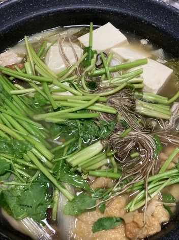 昨日の夜ご飯。2週間ぶりに二男が来たので夫が張り切って調理したせり鍋とまぐろカツでした。