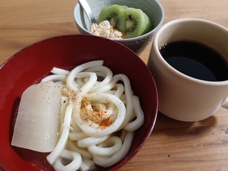 うどんにヨーグルト、コーヒーで朝ごはんでした(^^)