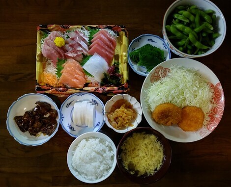 刺身の盛り合わせ、クリームコロッケ、かまぼこなどを食べました
