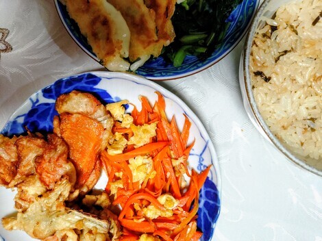 ギョウザ、にんじんシリシリや大根の葉、ホタテの炊き込みごはんなど