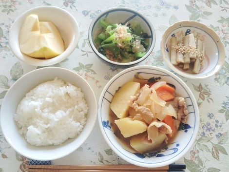 ごはん、肉じゃが、酢ごぼう、茹で小松菜、りんご