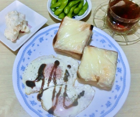 チーズトースト、目玉焼き、ポテサラ、枝豆を食べました。