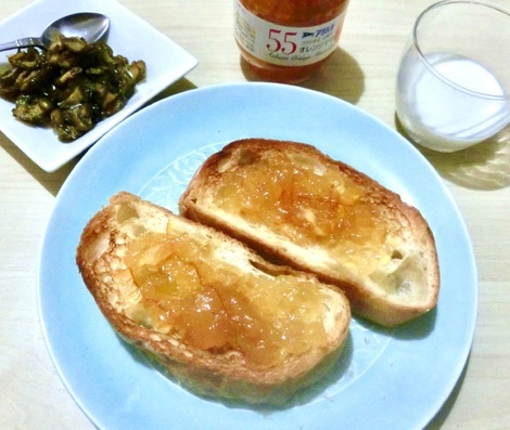 オレンジマーマレードトースト、キュウリの漬物を食べました。