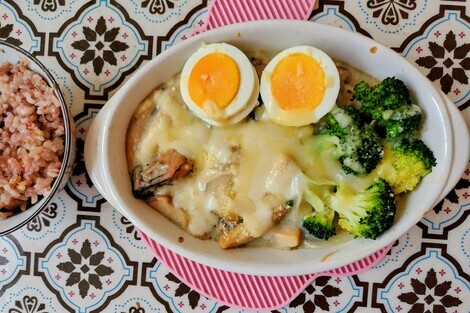 牡蠣のグラタンにゆで卵、ブロッコリーをのっけて熱々を食べました。