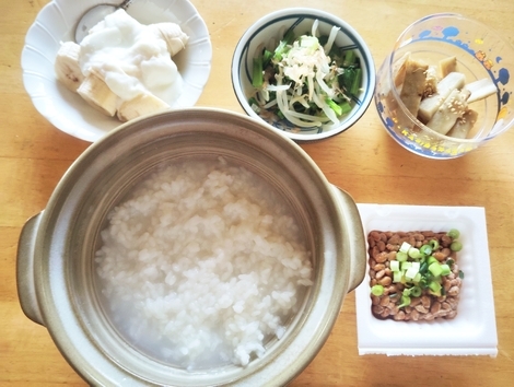 粥、納豆、酢ごぼう、茹で小松菜、バナナヨーグルト
