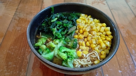 マルちゃん正麺の醤油にコーン·ブロッコリー·ほうれん草をトッピング