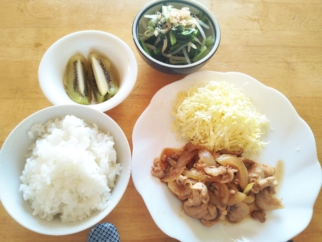 ご飯、生姜焼き、キャベツの千切り、茹で小松菜、キウイフルーツ