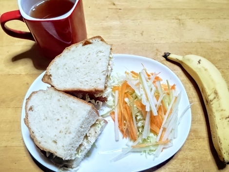 鶏むね肉のサンドイッチ、サラダ、バナナ、紅茶