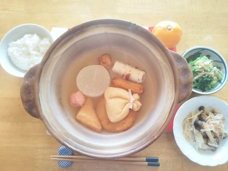 ごはん、おでん、茹できのこ、茹で小松菜、みかん
