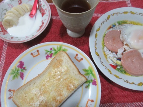 トースト、紅茶、目玉焼き、ソーセージ、ヨーグルト