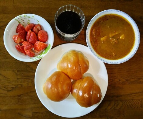 ロールパン、スープカレー、イチゴなどを食べました