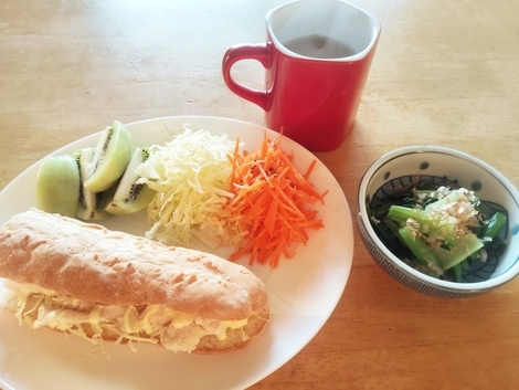 チキンサラダサンド、キャベツの千切り、キャロットラペ、ゆで小松菜、キウイフルーツ、コーヒー